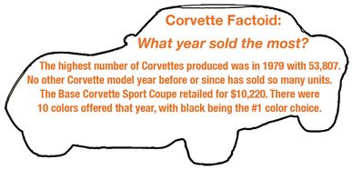The highest number of Corvettes produced was in 1979 with 53,807. No other Corvette model year before or since has sold so many units. The Base Corvette Sport Coupe retailed for $10,220. There were 10 colors offered that year, with black being the #1 color choice.